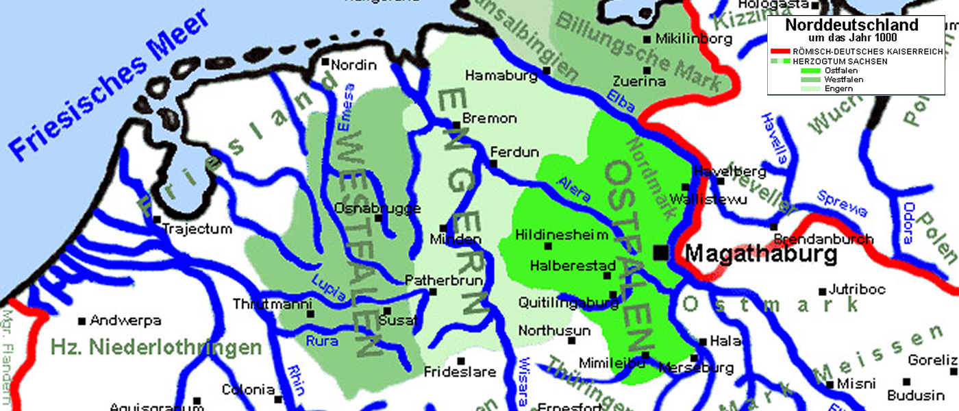 Der germanische Volksstamm der Sachsen um die erste Jahrtausendwende bestand aus drei Hauptvölkerschaften, den Ostfalen, Engern und Westfalen.